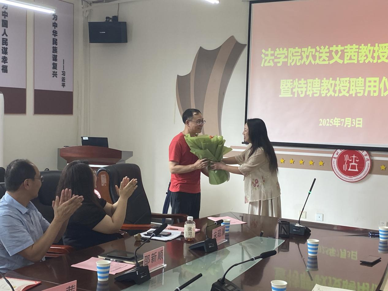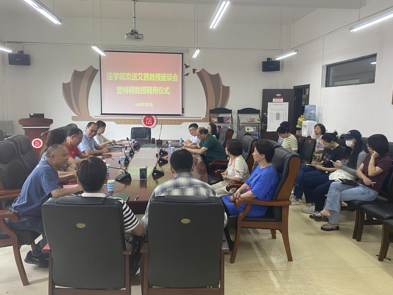 7月3日下午,法学院在文德楼310会议室为中央财经大学艾茜教授举行欢送座谈会暨特聘教授聘用仪式。法学院党委书记邵新顺、副院长(主持工作)曹务坤、副院长宋昭澜、合作促进处副主任贺婷、学院全体行政教师和部分教师代表出席会议。